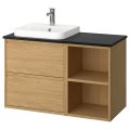 Comprises: 1 wash-stand with drawers, 1 open cabinet, 1 countertop, 1 semi-recessed wash-basin, 1 water trap and 1 mixer tap.